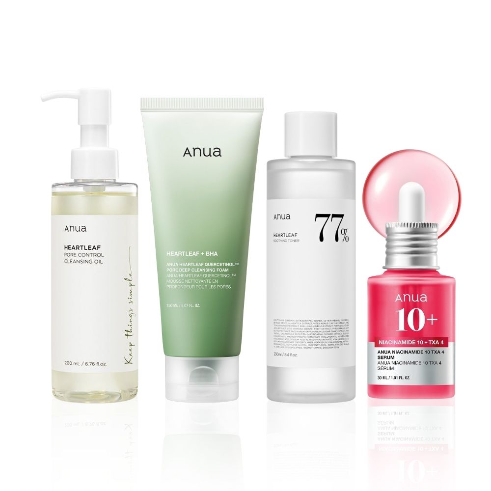 Begin your routine with the Heartleaf Pore Control Cleansing Oil, which effortlessly melts away sunscreen, makeup, and excess sebum without stripping the skin. Follow with the Heartleaf Quercetinol Pore Deep Cleansing Foam for a deeper, refreshing cleanse that leaves the skin clear and prepped. Next, the Heartleaf 77 Soothing Toner replenishes hydration while calming any post-cleanse sensitivity, helping to rebalance and smooth the skin. Finish with the NIACINAMIDE 10% + TXA 4% Serum, a potent brightening treatment that improves texture, reduces visible pores, and supports an even, luminous tone.