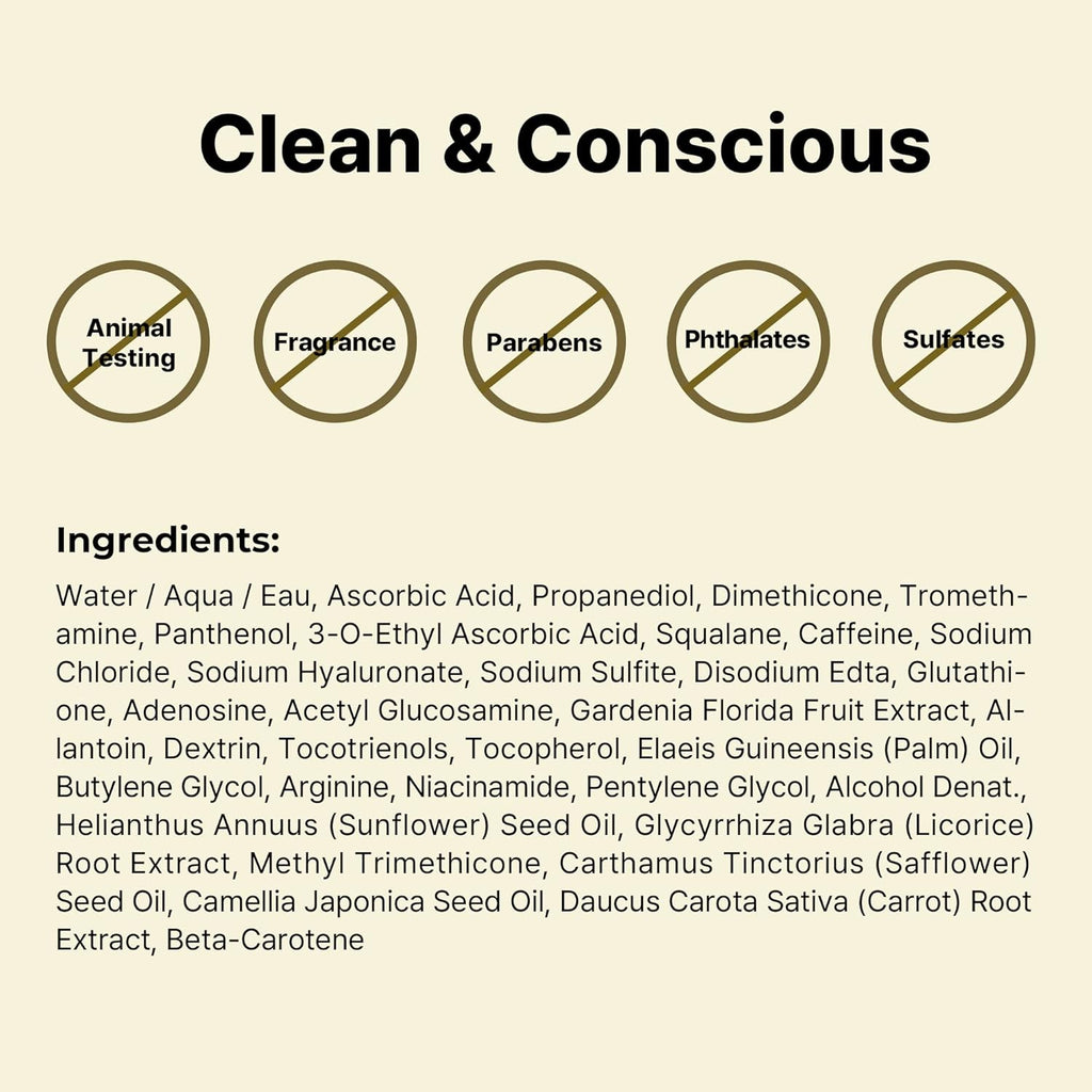 The high concentration of vitamin C in this serum works as a potent antioxidant that brightens skin, reduces pigmentation, and minimizes signs of aging. It’s supported by super vitamin E (tocotrienol), which has 50 times the antioxidant power of traditional tocopherol, aiding in collagen production and overall skin health. Added ingredients like hyaluronic acid and panthenol help retain moisture and soothe the skin, while caffeine and allantoin reduce puffiness and calm irritation. The result is skin that looks clearer, plumper, and more radiant after each use.